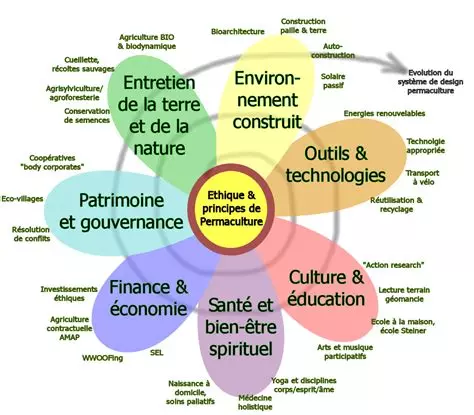 La permaculture est une méthode de création d'écosystèmes productifs et résilients. Pour cela, elle s'inspire de la nature et du fonctionnement des écosystèmes naturels en replaçant l'homme dans ces écosystèmes. Elle signifie "culture permanente". C'est à prendre dans tous les sens du terme culture. Culture au sens de "pratique culturale, et culture au sens de pratique culturelle. La permaculture part du principe qu'on ne peut pas changer le monde extérieur si on ne change pas son monde intérieur. En ce sens, elle s'applique à tous les aspects de notre vie et pas seulement au jardin ou à l'agriculture. On retrouve cet aspect très important dans la fleur permaculturelle, telle que vous pouvez la retrouver ci-contre.